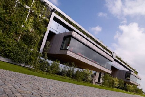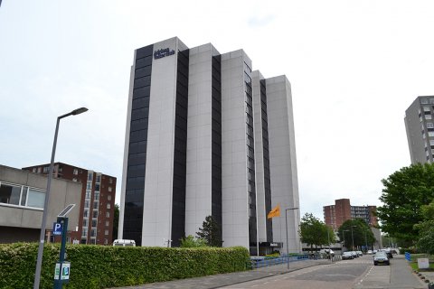 De zwarte gevelkozijnen van het Adriaan Volker Huis in Rotterdam werden door ons onder hoge druk gereinigd met warm water. Daarna werd het aanwezige vensterglas bewassen.