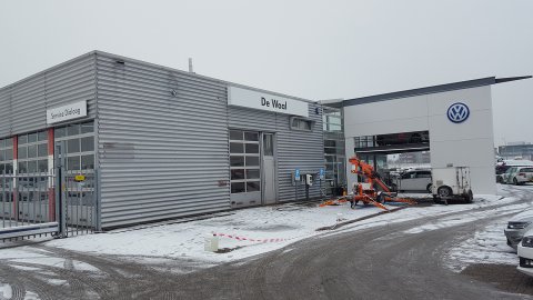 De zilverkleurige gevelbeplating van De Waal Auto Groep in Zaltbommel werd gereinigd met warm water onder hoge druk met als resultaat een gevel die als nieuw toont.